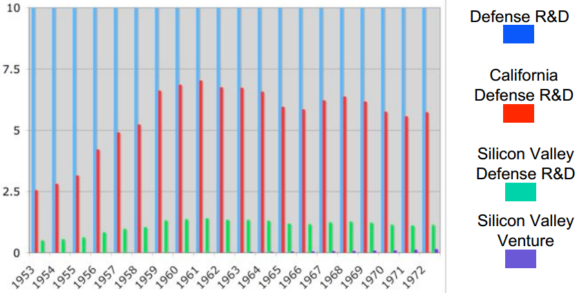 В кремниевой долине — в 50-х годах компании выполняли военные заказы на разработку различной электроники (радары, апполон, бортовые компьютеры для баллистических ракет и проч), и государство было крупнейшим покупателем на протяжении 60-х годов. Государство оставляло интеллектуальную собственность за исполнителями, но требовало предоставлять лицензии другим отечественным компаниям.