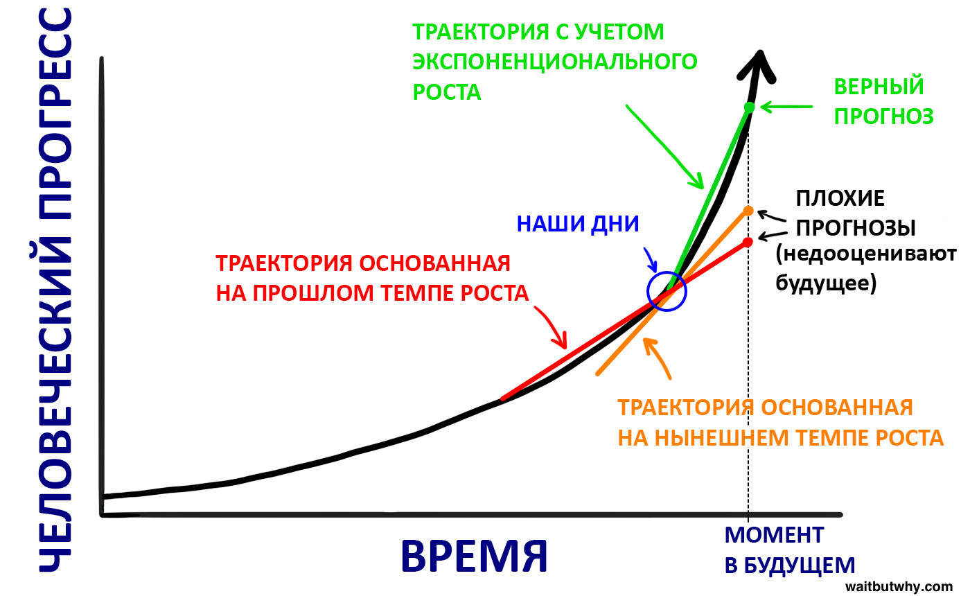 1) Когда дело доходит до истории, мы мыслим прямыми линиями. Мы представляем себе прогресс следующих 30 лет, воспринимая прогресс предыдущих 30 лет как на некий общий ориентир. Размышляя о том, как изменится мир за это столетие, мы просто думаем обо всех достижениях XX века и прибавляем некий их эквивалент к 2000 году. Эту же ошибку совершил парень из 1750, когда привез первого чувака из прошлого в надежде потрясти его так же, как был потрясен он сам, когда побывал в будущем. Линейное мышление является для нас интуитивным, в то время как нам следует думать экспоненциально. Тот, кто оказался поумнее, сможет предсказать прогресс следующих 30 лет, принимая в расчет нынешний темп развития и отталкиваясь уже от него. Его предсказание оказалось бы более точным, но все равно весьма далеким от истины. Чтобы думать о будущем правильно, следует представлять себе более высокие скорости развития, чем те, при которых мы живем сейчас.