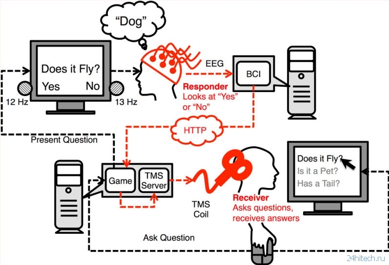Что примечательно, эта система совершенно неинвазивна, работает от устройства ЭЭГ, транскраниальной магнитной стимуляции (ТМС) и компьютера для обработки и перевода. Посылая мысленные сигналы «да» и «нет», участники в паре сумели правильно определять объекты типа собаки, находясь за километр друг от друга.