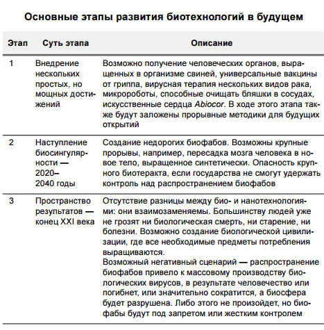 3. В перспективе — развитие гибрида компьютера с биопринтером — биофаба, который позволит напрямую создавать биологические существа с заданными функциями.