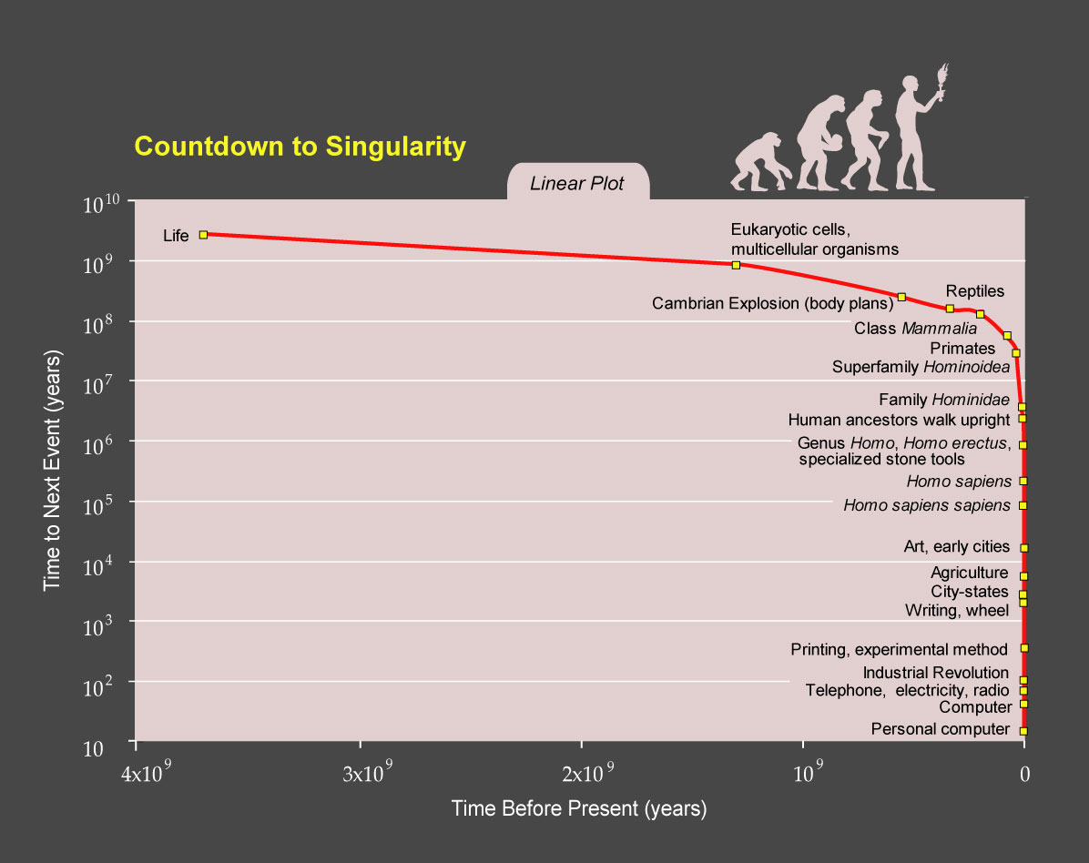Пожалуй начну с разъяснения понятия «технологической сингулярности»… Технологическая сингулярность - момент времени, по прошествии которого прогресс станет слишком активным и непостижимым для человека, следовательно и не контролируемым. Подобную идею впервые описал Фридрих Энгельс : «Наука движется вперед пропорционально массе знаний, унаследованных ею от предшествующего поколения.» По его мнению скорость прогресса возрастает пропорционально квадрату расстояния во времени от ее возникновения.