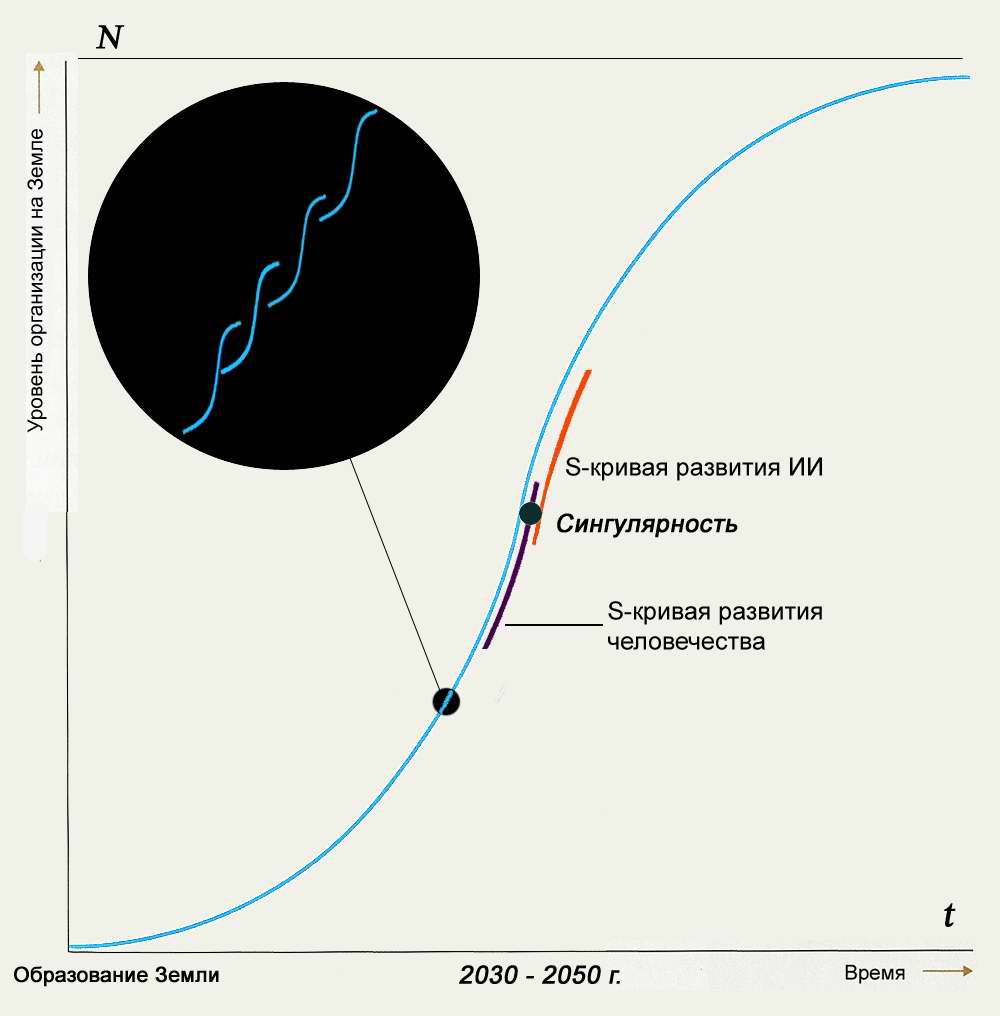 1. Искусственный интеллект-технология создания интеллектуальных машин и программного обеспечения со сходной задачей использования компьютеров для понимания человеческого интеллекта. Опасность этого сценария заключается в том, что уровень человеческого интеллекта повышается не равномерно и напрямую зависит от научных событий, в то время как развитие ИИ нечем не ограничено и происходит в прогрессии. На графике 2 показана точка сингулярности и уровень развития ИИ и человеческой расы при подобном сценарии апокалипсиса.