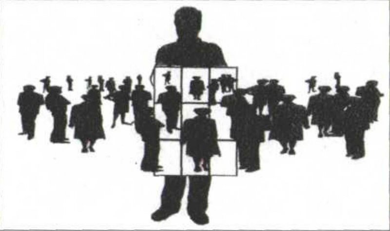 Схематическое представление активного камуфляжа, применяемого для маскировки человека, стоящего впереди группы людей.