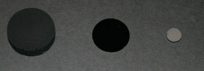 В настоящее время существует еще один подход... Исследователи из университета Ренселайера и Райса получили самый темный материал, когда-либо созданный человеком. Материал представляет собой тонкое покрытие, состоящее из разряженных массивов свободно выровненных карбоновых нанотрубок; он имеет общий показатель отражения 0,045%, то есть поглощает 99,955% падающего на него света. Как таковой, материал подходит очень близко к так называемому «суперчерному» объекту, который может быть фактически невидимым. На фото показано как новый материал с отражающей способностью 0,045% (в центре), значительно темнее 1,4% стандарта отражательной способности NIST (слева) и куска стекловидного углерода (справа).