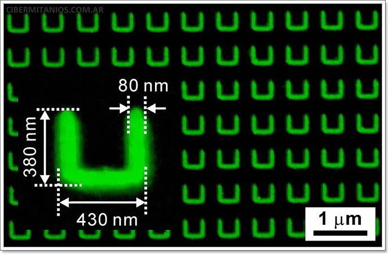 Изображение электронного микроскопа готового 3D метаматериала. Резонаторы из разрезных золотых наноколец расположены ровными рядами.