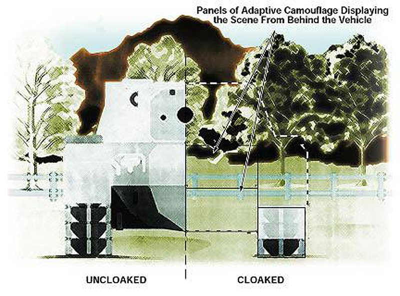 Были предложены легкие оптико-электронные системы на базе современных формирователей изображения и дисплеев, которые делают выбранные объекты почти прозрачными и таким образом фактически невидимыми. Эти системы названы системами активного или адаптивного камуфляжа в связи с тем, что в отличие от традиционного камуфляжа они генерируют изображения, которые могут меняться в ответ на изменения сцен и условий освещенности.