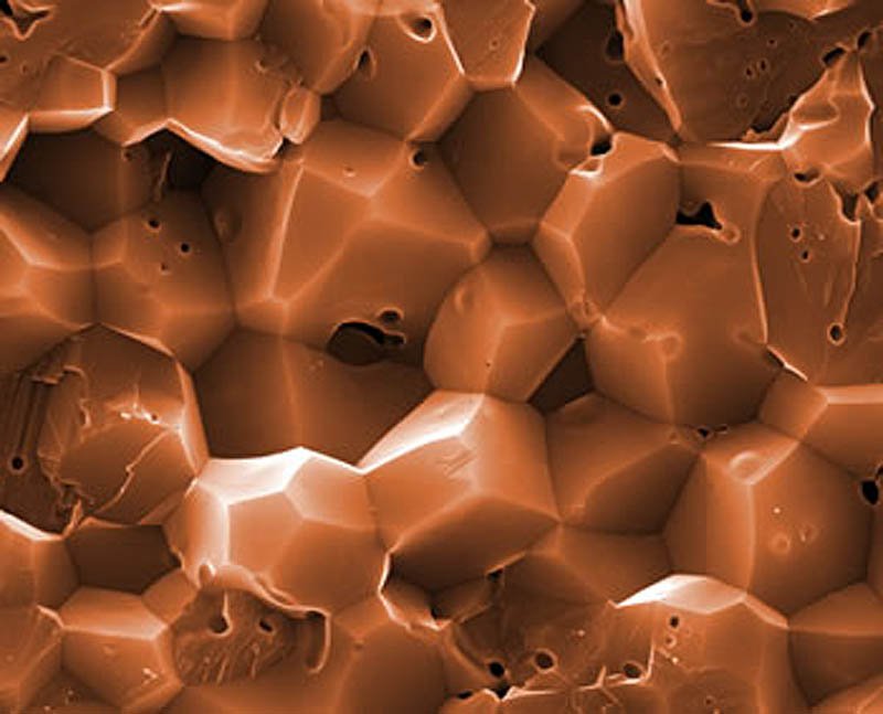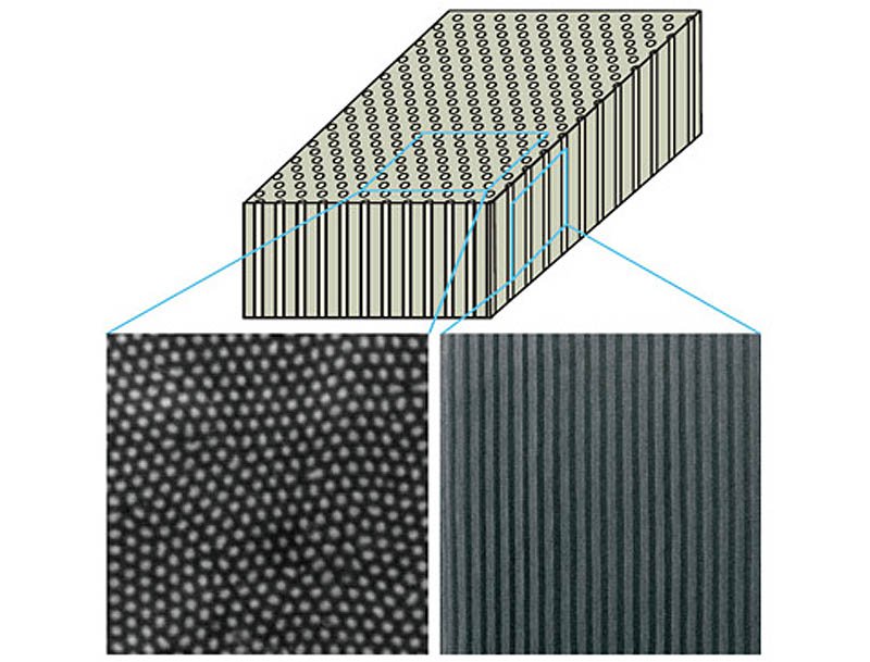 Схематическое изображение и изображение с электронного микроскопа метаматериала (сверху и сбоку), разработанного исследователями из калифорнийского университета в Беркли. Материал сформирован из параллельных нанонитей, встроенных внутрь пористого оксида алюминия. При прохождении видимого света через материал согласно феномену негативного преломления он отклоняется в обратном направлении.