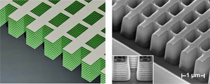 Слева схематичное изображение первого 3-D «сетчатого» метаматериала, разработанного в калифорнийском университете который может достигнуть отрицательного показателя преломления в видимом спектре. Справа изображение готовой структуры со сканирующего электронного микроскопа. Перемежающиеся слои формируют небольшие контуры, которые могут отклонить свет назад.
