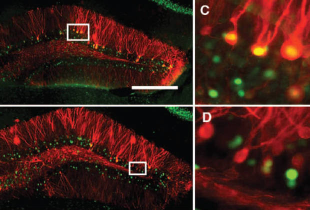 В одном и том же контексте метки получают одни и те же наборы нейронов: красный — белок-метка, зеленый — c-fos. Мышей метили, помещая в клетку А, а затем переносили либо обратно в клетку А (вверху), либо в клетку С (внизу).