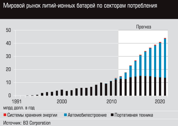 — Я бы так не сказал — скорее он не подтвердил радужных расчетов маркетологов: в 1995 году было продано таких батарей всего на несколько сотен тысяч долларов по всему миру, дело двигалось еле-еле, и это при таких-то ожиданиях. Ну а затем рынок портативной техники стал развиваться просто дикими темпами, появился Windows и лэптопы, электронные игрушки и мобильные телефоны, соответственно, потребность в батарейках все более и более возрастала. И уже через пять лет продажи превысили 5 миллиардов долларов, а в текущем году дорастут почти до 20 миллиардов (см. график. — «Эксперт»). Мы ожидаем, что к 2020 году рынок превысит 40 миллиардов долларов, но это при обязательном условии развития электромобилестроения.