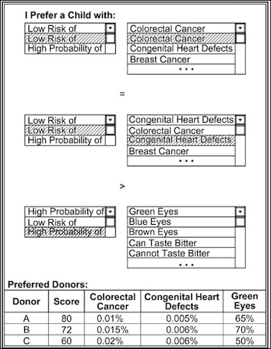 Иллюстрация элемента интерфейса системы «проектирования» детей. Выбор партнера с помощью сервиса 23andMe может быть полезен и с медицинской точки зрения, поскольку минимизирует риски врожденных и приобретенных заболеваний