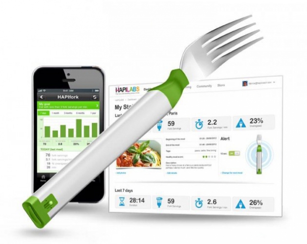 Существует масса программ и веб-сайтов, помогающих следить за своим рационом, а вот подобных гаджетов не много. Свежая разработка от французского инженера Жака Лепэна и компании Hapilabs (производит гаджеты для здоровья и активного образа жизни) – вилка Hapifork. Прибор следит, насколько быстро ест его владелец, и в случае превышения скорости начинает возмущенно вибрировать. Вилка запоминает пищевые привычки (время, потраченное на еду, количество пищи, скорость употребления) и на основе этих данных давать владельцу рекомендации. Всю информацию она передает через USB-порт или Bluetooth. В продажу вилка поступит в этом году.