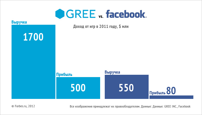 Если Facebook совместно с Zynga и произвел революцию в социальных играх, то ее последствия можно ощутить на десктопах. В том, что касается смартфонов, GREE нокаутирует обе компании в первом раунде. Выручка GREE от мобильных социгр драматически превосходит выручку Facebook от их PС-аналогов (на смартфонах в этом сегменте Цукерберг зарабатывает мизерные деньги).