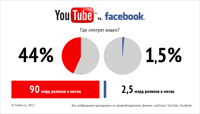 Ролики из YouTube гуляют по Facebook, однако масштаб этого явления значительно меньше, чем можно представить. На долю сети Цукерберга приходится лишь 1,3% времени, проводимого людьми за просмотром онлайн-видео. Наверняка Facebook хотел бы увеличить этот показатель, но качество в данном случае значительно важнее количества. Сага о том, как черепаха живьем съедает голубя, не представляет для Facebook интереса — едва ли этот трэш привлечет рекламодателя. Соцсеть №1 волнует тот контент, который можно монетизировать. Например, Facebook сейчас пытается уговорить сервис потокового музыкального видео Vevo (владеют самым популярным каналом на YouTube) сменить площадку и перейти к ним.