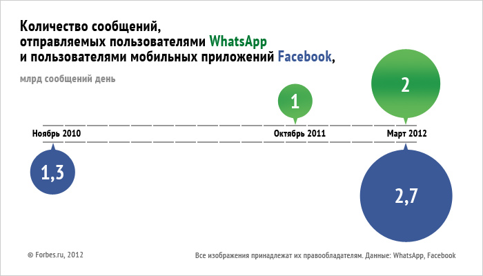 Интенсивность обмена сообщениями среди пользователей WhatsApp растет гораздо быстрее, чем среди пользователей мобильных версий Facebook. При сохранении динамики летом 2012 года WhatsApp обойдет приложения Facebook по количеству месседжей в сутки. Кум буквально выдирает из рук у Цукерберга первенство в одной из важнейших функций соцсети — личных сообщениях.