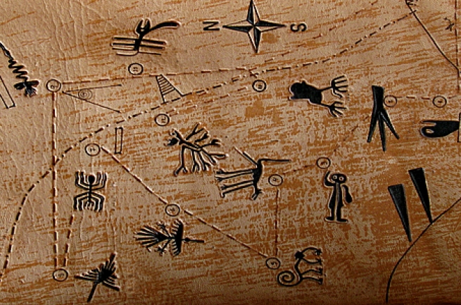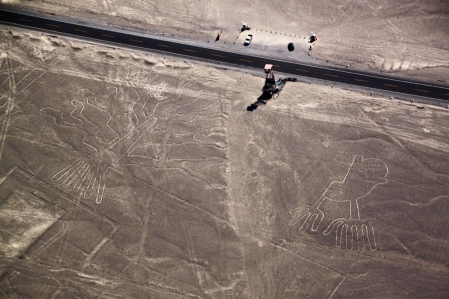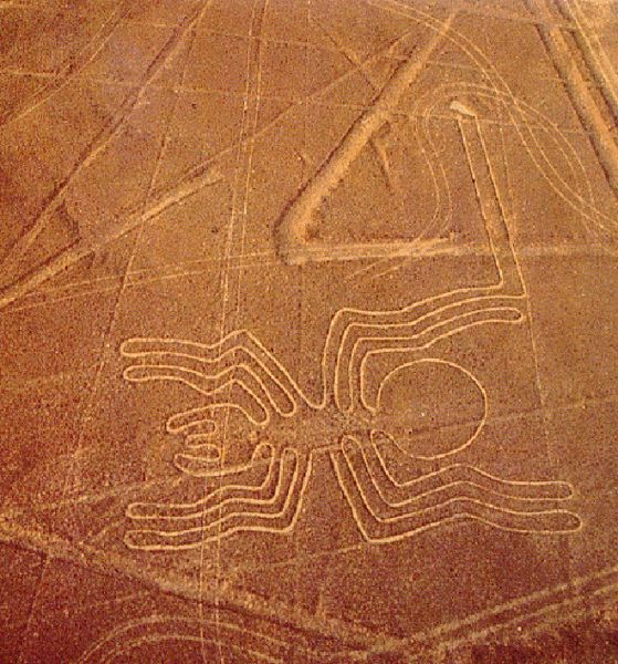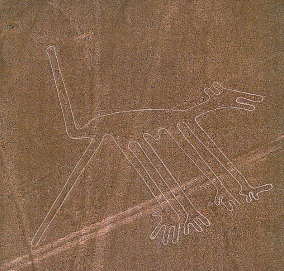 В южной части Перу на пустынном плато под названием Наска находится поистине необычное "произведение искусства". Правда, увидеть его можно только с высоты птичьего полета, поэтому замечено оно было лишь в 1939 году - американский археолог Пол Косок пролетал над плато на самолете. Целое скопление древних гигантских рисунков представилось во всем своем величии: собака, колибри, «астронавт», обезьяна, кит, паук, кондор, цветы, дерево, руки…всего их около 30-ти штук. Все они выполнены в одном стиле и достигают 200 метров в размерах. Также долина буквально исчерчена полосами (около 13000), треугольниками, трапециями и спиралями (около 700).