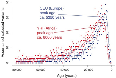 Эта лавина мутаций дает кучу "сырья" для эволюции. Некоторые мутации очень быстро распространяются среди людей и, скорее всего, станут обычными чертами человека.