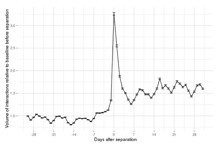 Непосредственно перед разрывом все эти показатели начинают резко расти. Средневзвешенное число взаимодействий через социальную сеть в день размолвки возрастает более чем втрое. Затем активность постепенно стабилизируется и в течение следующей недели постепенно снижается до уровня, превышающего первоначальный.