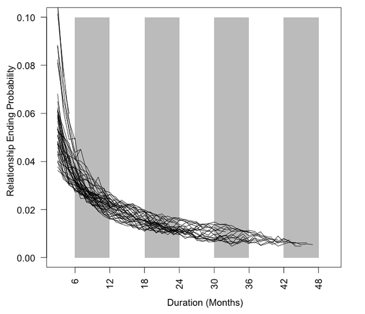 Аналитики Facebook, попытались выяснить это в ходе другого исследования. Принято считать, что прочность отношений определяется их длительностью. Чем дольше двое встречаются, тем меньше вероятность размолвки в паре. Различные жизненные обстоятельства и личностная несовместимость обычно приводят к краху отношений в самом начале, когда люди ещё мало знают друг друга.