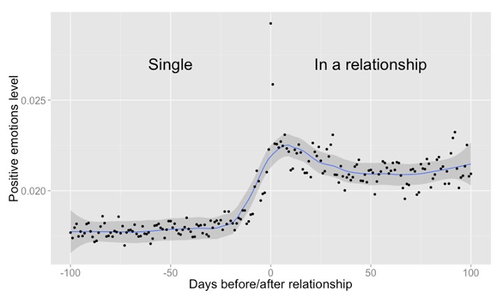 В случае успешного развития отношений за несколько дней до смены статусов в их профилях отмечается всплеск использования эмотиконов и выражений с позитивной эмоциональной окраской. Слово «любовь» и ласковые формы обращения в адрес друг друга звучат значительно чаще.