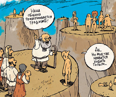 Житель Утопии — об инакомыслящих маргиналах. «Кое-где еще сохранился дремучий фундаментализм — национализм, религиозная нетерпимость. Но все это постепенно сходит на нет. Так что лично меня беспокоят группы, которые считают, что надо резко увеличить налоги на некоммерческие расходы — с 1 до 1,2% — на помощь слабым, инвалидам, животным. Я сам отчисляю взносы в благотворительный фонд и считаю, что такое решение было бы ущемлением моих прав».
