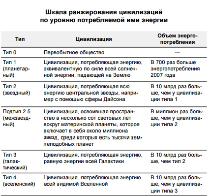 Переход к типу 3 потребует не менее 100 000 лет, а к типу 4 — миллиардов лет. Однако почти наверняка к концу XXI века мы станем цивилизацией 1-го типа, овладев всей энергией Солнца, которая падает на Землю. А при самом радикальном развитии событий, если начнется активная трансформация Солнечной системы с по- мощью роботов-репликаторов, мы можем приблизиться и ко 2-му типу, то есть начать строить сферу Дайсона и потреблять большую часть энергии Солнца.