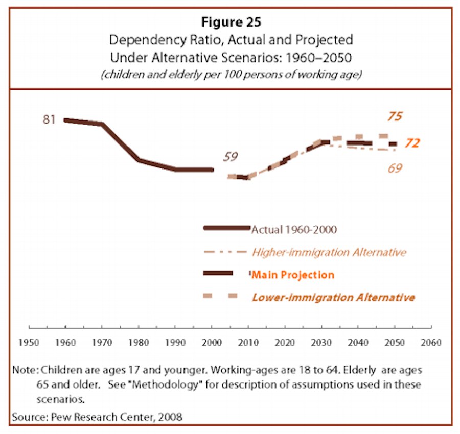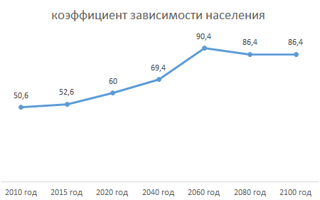 Произойдет существенное старение населения. На 100 человек в рабочем возрасте будет приходиться от 69 до 75 детей и стариков, хотя сейчас это число находится на уровне 60.