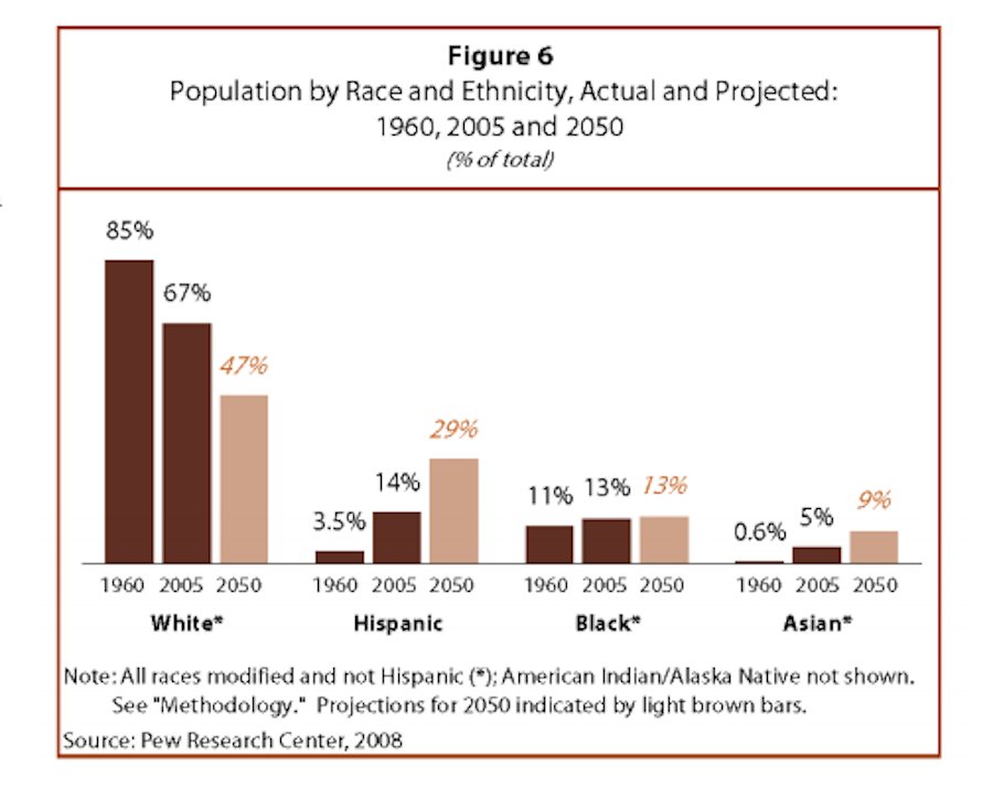 Это приведет к сильному изменению расового состава – к 2050 году четверть населения будет составлять испаноязычное население, 128 млн человек. Число азиатского и черного населения США также сильно вырастет – 41 и 59 млн человек соответственно. Число белых почти не изменится – сейчас 199 млн, будет 207 млн.