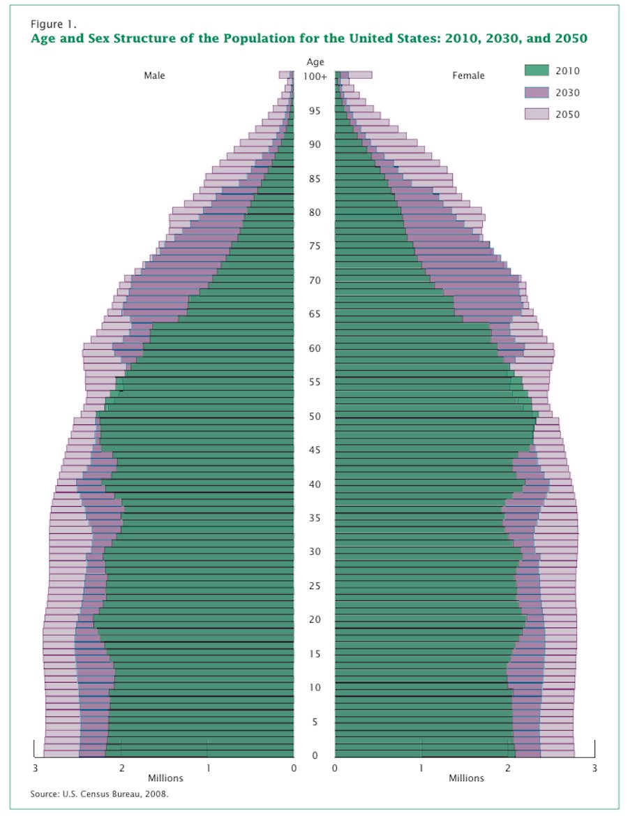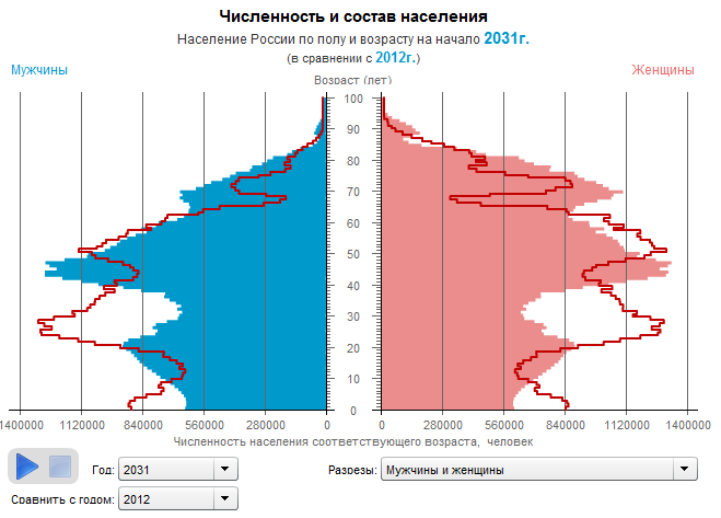 Вот как будет выглядеть стареющая пирамида в 2030 году (мультик от Росстата можно посмотреть тут): основной возрастной группой будет население в возрасте от 40 до 60 лет, которые к 2050 году переместятся в группу 60+. Как с такой демографической нагрузкой справляться молодежи будущих поколений, должно волновать будущих стариков уже сейчас.