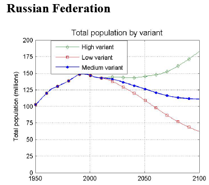 Средний вариант прогноза ООН предполагает, что население России к 2050 году сократится до 125 млн человек.