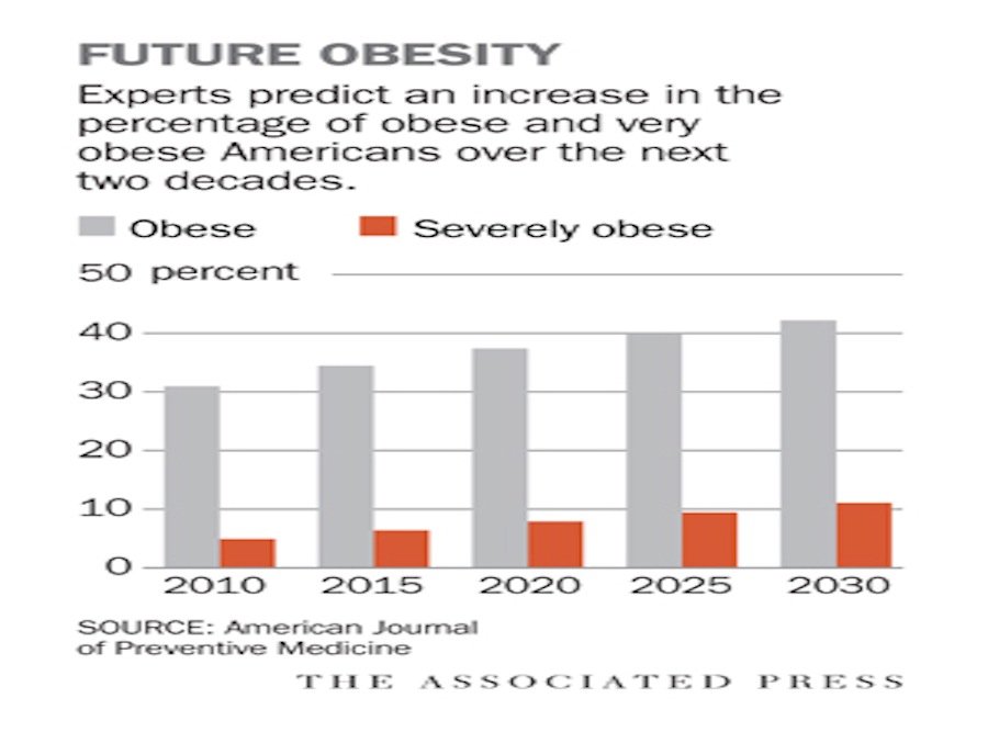 Важная проблема, с которой придется столкнуться населению США, – ожирение. К 2030 году 40% американцев будут излишне тучноваты.