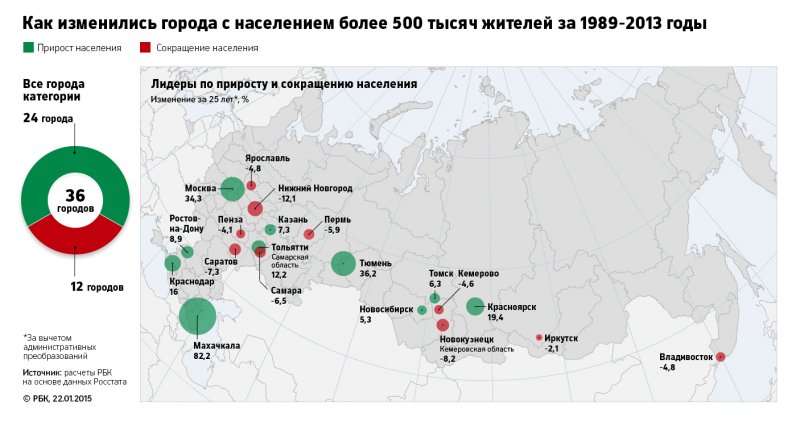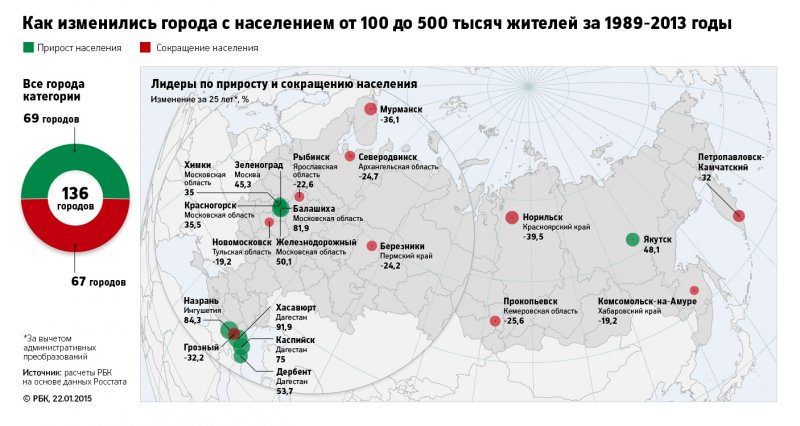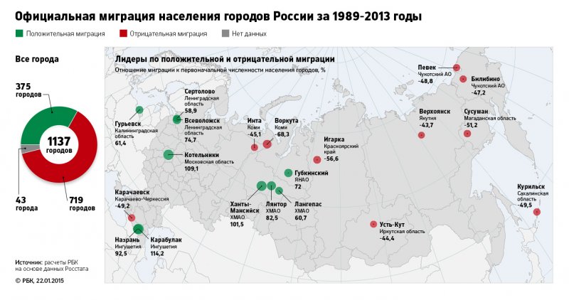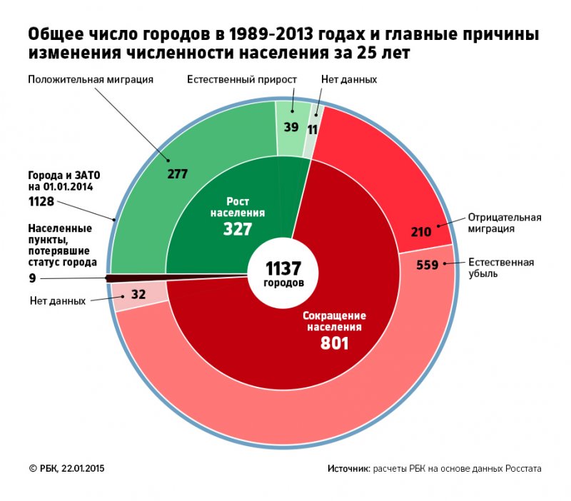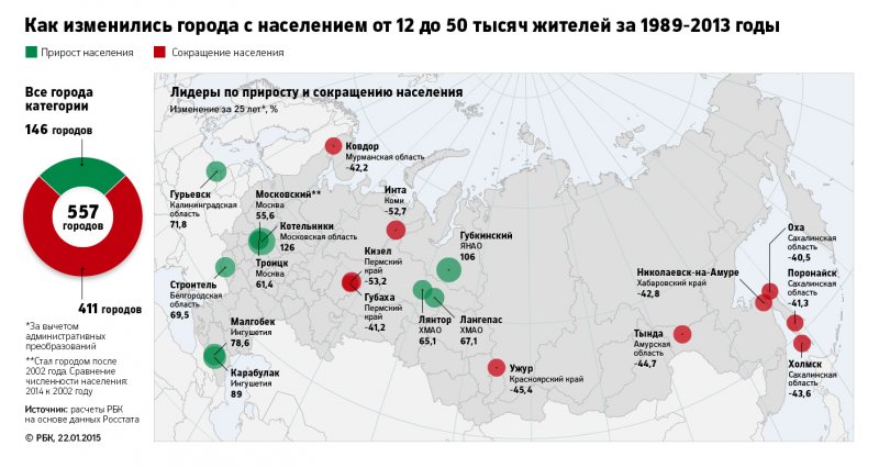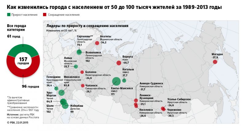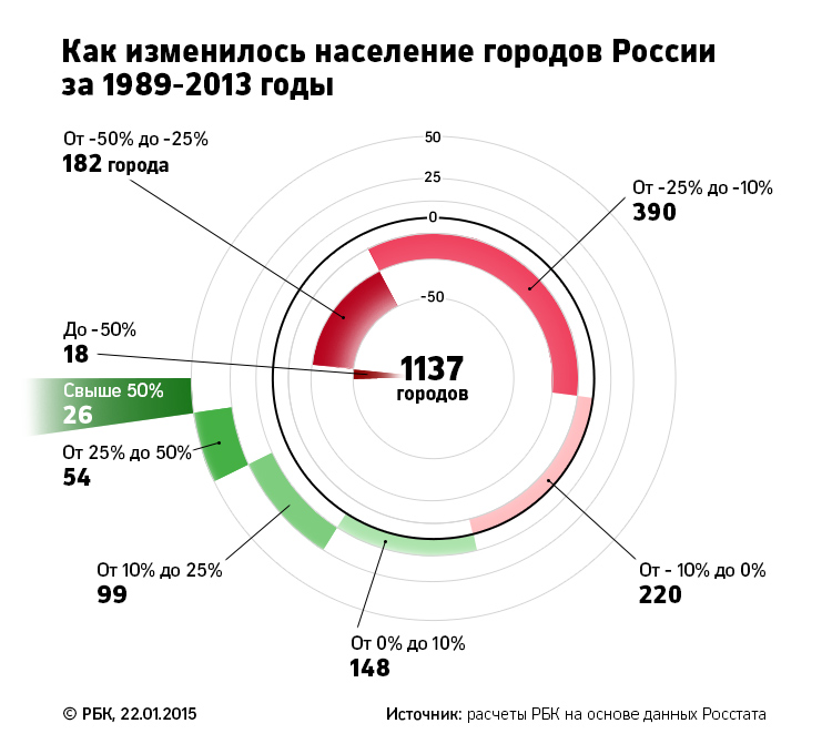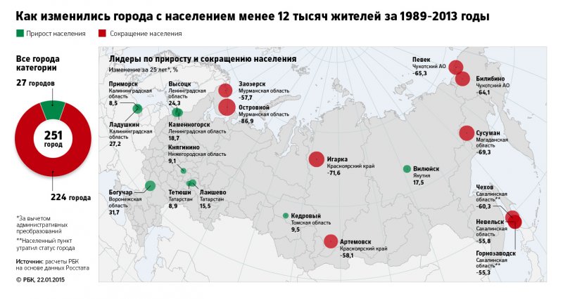 Согласно расчетам РБК, в 801 городе России, это 71% от общего числа городов, население за последние 25 лет уменьшилось (подробнее о методике расчета – читайте «Как мы считали» в конце материала). Численность жителей 14 городов сократилась более чем наполовину (если в этот список включить населенные пункты, потерявшие статус города, то их число вырастет до 18); около 200 городов потеряли более четверти населения. Больше всех пострадали северные и дальневосточные города: с началом рыночных преобразований жители оказались на грани выживания и вынуждены были мигрировать.