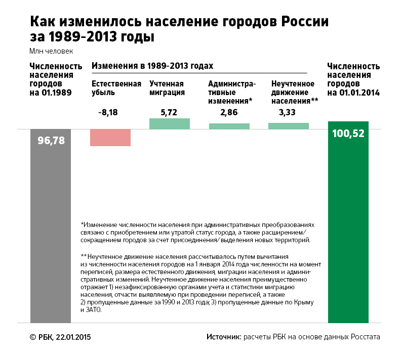 За 1989–2014 года естественная убыль (рождаемость минус смертность) населения городов составила не менее 8,2 млн. Однако эта убыль компенсировалась миграцией из села и стран ближнего зарубежья, а также административными преобразованиями, когда сельские поселения включались в состав городов. В результате жителей городов стало больше на 3,7 млн (+3,1%). Но если не учитывать административные изменения, то прирост за 25 лет будет равен всего 0,9%.