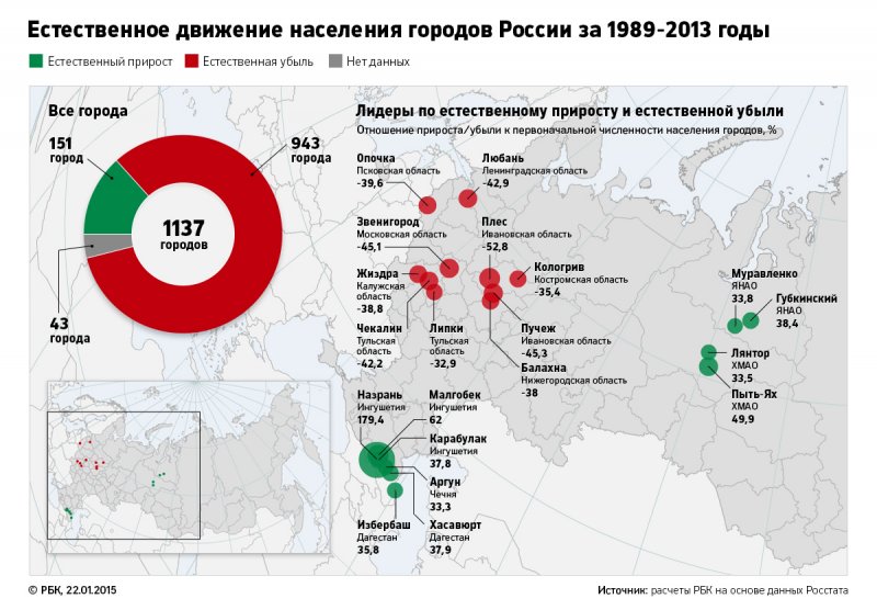 Лидером по естественному приросту населения в городах за все 25 лет является Ингушетия (рост в 2,3 раза), затем Дагестан (+30%), Ямало-Ненецкий АО (+23%) и Ханты-Мансийский АО (22%).