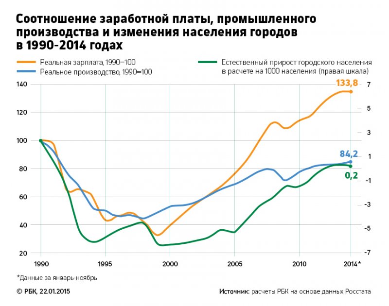 К концу 90-х годов, по данным Росстата, промышленность России сократилась в два раза по сравнению с 1990 годом, а реальная заработная плата – в 2,5-3 раза, что существенно повлияло на рост смертности и снижение рождаемости в городах. Спад производства и реальных доходов населения привел к естественной убыли горожан, причем у этих показателей наблюдается положительная корреляция.