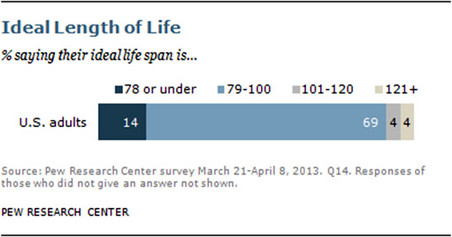 56% опрошенных американцев в возрасте от 18 и старше сказали, что они не хотели бы жить до 120 лет или больше. 69% американцев хотели бы прожить от 79 до 100 лет.