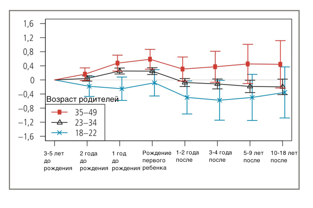 Но в тоже время, появление малыша в молодых семьях, возрастом от 18 до 22 лет не влияет на уровень счастья и даже наоборот. Еще до рождения ребенка уровень удовлетворенности у молодых падает, и после рождения уже не восстанавливается. В семьях где родителям от 22 до 24 лет удовлетворенность устойчиво держится, появившись во время зачатия и после 1 года жизни ребенка, резко падает. Людей не покидает счастье, в том случае, когда рождение детей происходит после 34-летнего возраста. На многие годы ребенок способен осчастливить семейную пару. Количество детей в семье также влияет на присутствие гармонии, при этом каждый последующий ребенок имеет все меньшее влияние на эффект счастья.