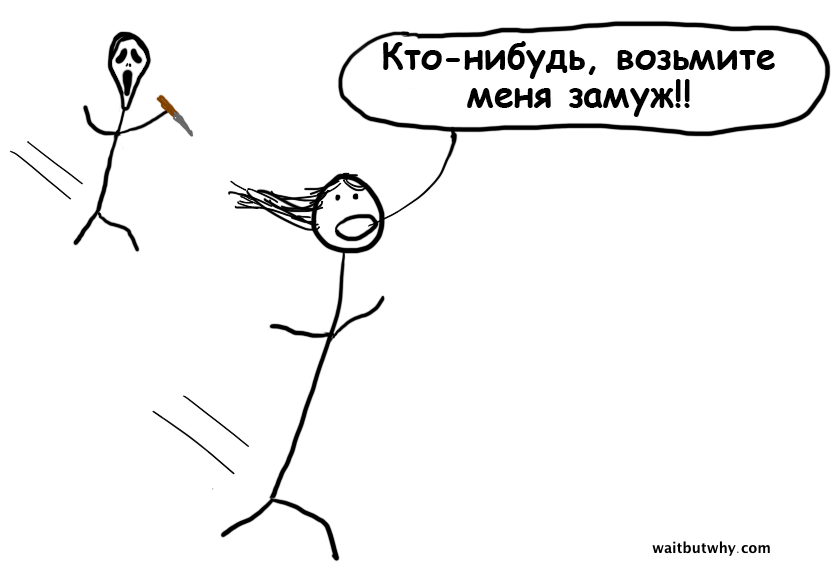В нашем мире главное правило — пожениться до того, как станешь слишком стар, и «слишком стар» варьируется от 25 до 35 лет, в зависимости от того, где вы живете. Хотя правило должно быть таким: «что бы ты ни делал, не женись на не том человеке». 37–летний неженатый человек вызывает у общества больше неодобрения, чем 37–летний, состоящий в несчастливом браке с двумя детьми. Это лишено всякого здравого смысла, ведь первый находится всего в одном шаге от счастливого брака, тогда как последний должен либо смириться с постоянным несчастьем, либо пройти через тяжелый развод, чтобы только догнать первого.