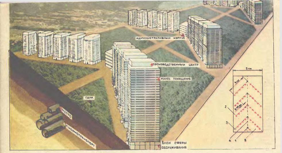 На иллюстрации журнала изображен фрагмент жилого района города будущего. Из панорамного окна квартиры открывается вид на кинотеатр, торговый центр, бытовой комплекс, кафе - все это сосредоточено вблизи жилых домов. Неподалеку от общественного центра расположились четырех- и пятиэтажные жилые дома. А правее - дома гостиничного типа для малосемейных. Для детей устроен мелкий бассейн. Неподалеку сооружены спортивный павильон, открытый плавательный бассейн, стадион. В стороне от домов, в района общественного центра предусмотрена стоянка для автомашин.