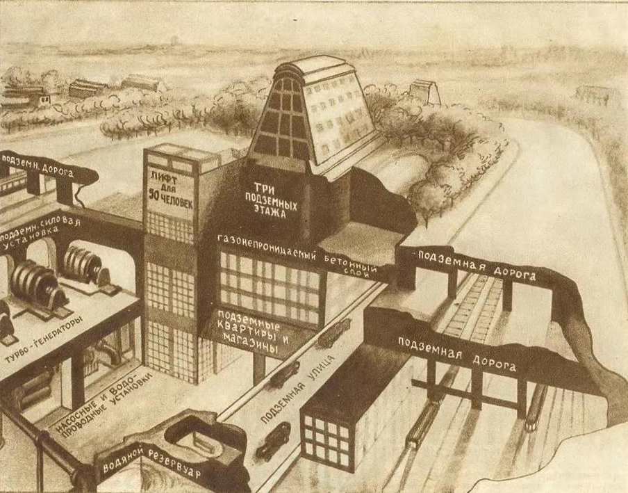 "... вместительные лифты спускают жителей в подземные дома, защищенные сверху мощным слоем бетона. Турбогенераторы и насосные станции снабжают подземные жилища светом, теплом, воздухом и водой. Если весь проект несбыточен, то это нельзя сказать об отдельных его деталях. Так, например, проблема частичного переноса городского движения под землю разрешается не только устройством метрополитена, но и сооружением целых подземных улиц и автомагистралей", - писали авторы "Техника - молодежи" в январском номере за 1937 год.