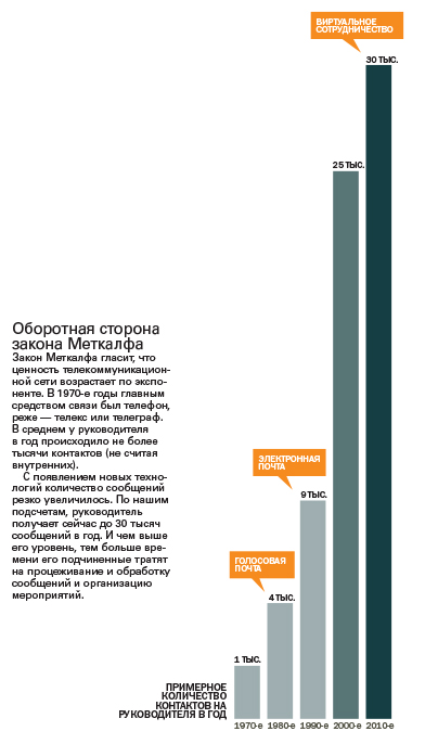 Цунами электронной переписки. Электронные коммуникации, рассылка и переписка, резко подешевев, заполонили рабочее пространство. Многие руководители получают по 200 писем в день — более 30 тысяч в год, а распространение системы быстрых сообщений и краудсорсинговых приложений усугубили проблему (см. врезку «Оборотная сторона закона Меткалфа»). Если тренд сохранится, то возня с электронными посланиями займет у руководителя более одного рабочего дня в неделю.