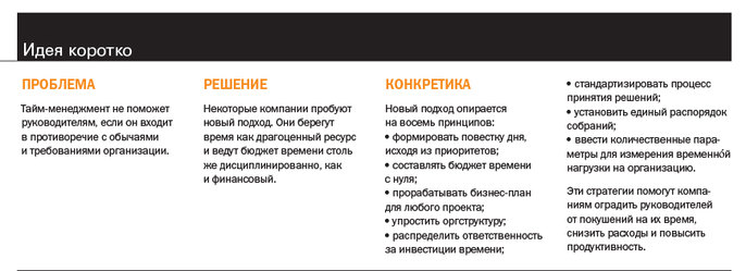 Некоторые современно мыслящие компании решительно сменили подход: они хотят, чтобы руководители ценили драгоценный ресурс времени и бережно им распоряжались. Свой бюджет часов они планируют столь же тщательно, как финансовый. Эти организации не только сократили административные расходы, но и высвободили время руководителей и сотрудников, стимулировали инновации и в результате ускорили рост.