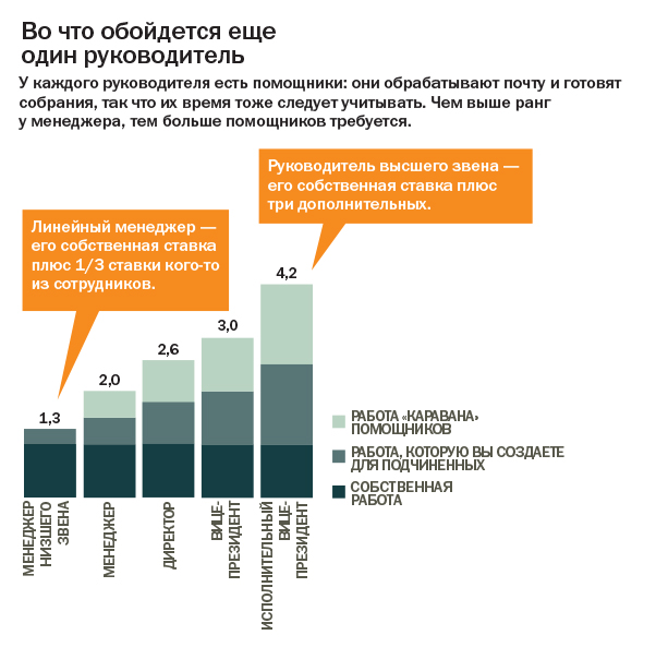 Упростите структуру организации. Чем больше уровней отделяет гендиректора от тех, кто непосредственно работает с клиентами, тем дольше идет информация и тем труднее принимать решение. Все руководители знают это, но не все делают выводы. И еще: многие не понимают, что каждый дополнительный супервайзер — это лишние расходы, далеко превосходящие стоимость самой штатной единицы. Промежуточная инстанция организует свои собрания, и значит, кто-то должен готовить выступления, кто-то их оценивать, и каждое собрание порождает множество себе подобных. Мы вычислили, что в среднем появление нового менеджера в организации добавляет работы на полтора человека — его ставка плюс еще 50% времени одного из подчиненных, а каждый дополнительный вице-президент создает работу для 2,6 человека. Менеджеров и вице-президентов сопровождает целый «караван» помощников, от личного секретаря до руководителя команды — и это еще больше работы и издержек. (См. врезку «Во что обойдется еще один руководитель».) Работы становится все больше, а времени — все меньше.