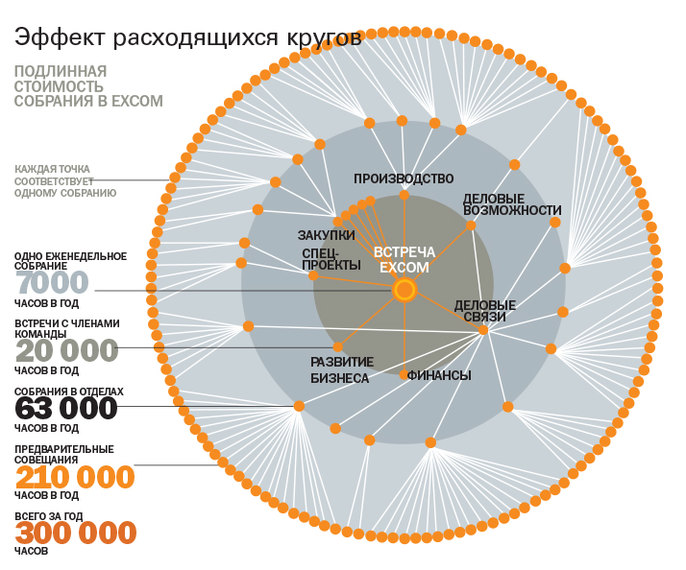Долгие встречи. Руководители вынуждены участвовать во все большем числе мероприятий. Отчасти причина в том, что режим теледоступа упростил участие. В среднем топ-менеджеры тратят более двух рабочих дней в неделю на конференции с участием трех или более сотрудников; в целом 15% времени организации расходуется на эти мероприятия, и доля эта неуклонно растет с 2008 года. (см. врезку «Эффект расходящихся кругов»).