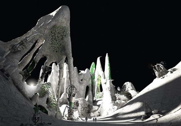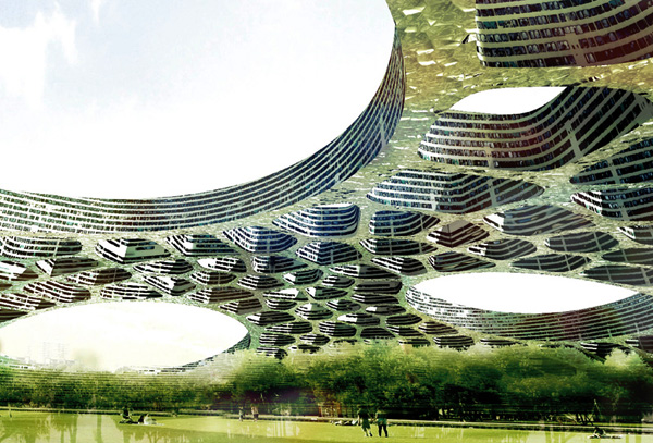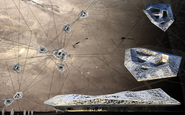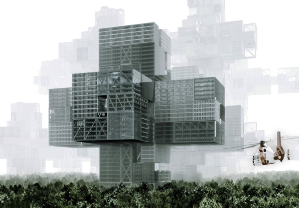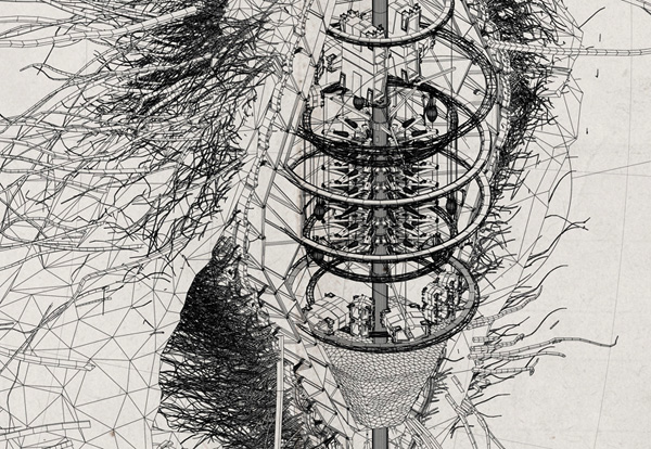 Башня Корневище –тысячи подземных плато предполагает создание подземного города. Это ответ на резкие изменения климата и прочие экологические катастрофы. Основной идеей является разработка «земле скреба», который использует наземные и подземные ресурсы, создавая новую типологию жизни. Проект разделен на 4различных уровня, которые организованных вокруг центрального ядра. Первый слой находится над поверхностью, где будут размещены пищевое производство, сельскохозяйственные фермы и места для развлечений и отдыха. Весь фасад покрыт фотоэлементом для сбора солнечной энергии, а отдельные секции также оборудованы ветряными турбинами. Второй слой, примерно на 60 уровнях, жилая часть с целым рядом различных жилых помещений, соответствующих размеру семьи. Третий и четвертый слои используются в качестве обслуживающих площадей и офисов, наряду с самой глубокой частью проекта, посвященной изучению и сбору геотермальной энергии.