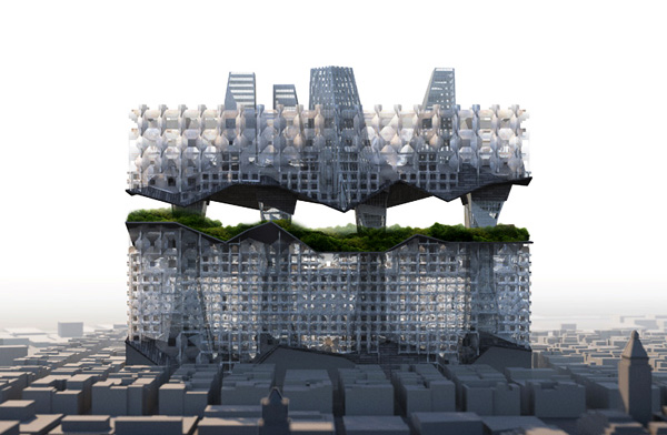 Район № 6 – Нью-Йорк. Расположившись над существующим городским полотном, это здание занимает пространство между 22-й и 14-й улицами и 6-й и 7-й авеню в Нью-Йорке. Размер структуры создает взаимозависимость и позволяет формировать новую общину в рамках уже плотной застройки. Вплетенные в полотно жилых построек, большие офисные башни обеспечивают рабочее место для жителей структуры. Эти башни развернуты для создания общественного парка высоко над городом, для доступа населения к природе.