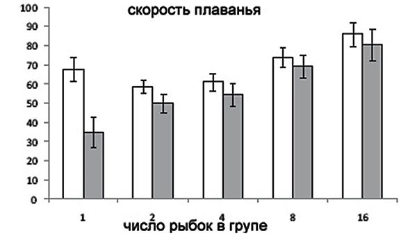 Гистограмма на рис. 2 показывает, что с размером группы увеличивается скорость плаванья; особенно хорошо это видно в больших группах. У одиночек скорость плаванья в зоне принятия решений наименьшая, в группе из 16 рыбок она увеличивается вдвое по сравнению с одиночками. При этом время, затраченное на преодоление зоны принятия решений, также постепенно сокращается.