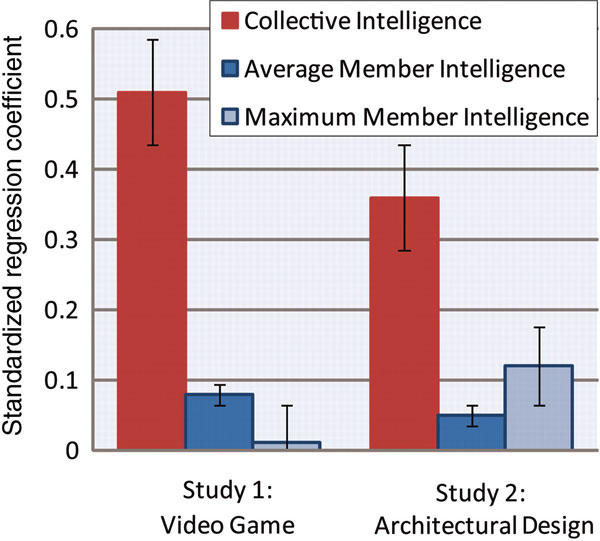 Коэффициенты показывают, насколько три разных фактора — коллективная разумность, или фактор c (красный цвет), усредненный интеллект членов коллектива (синий), максимальный интеллект среди членов коллектива (голубой) — могут предсказать успешность решения контрольного задания — видеошашек или строительства условной усадьбы. Красные столбики явно выше. График из обсуждаемой статьи в Science