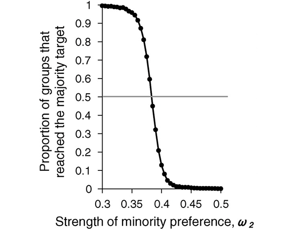 Итоговый консенсус в такой ситуации зависит от численного соотношения сторонников двух точек зрения (N1/N2) и от соотношения их упрямства (мотивированности, убежденности; ω1/ω2), где N1 и ω1 — характеристики большинства, N2 и ω2 — меньшинства. Чем ниже значения N1/N2 и ω1/ω2, тем больше шансов у меньшинства увлечь группу за собой.