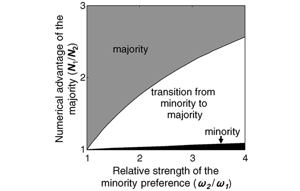 Зависимость коллективного решения от численного превосходства большинства над меньшинством (N1/N2, вертикальная ось) и от повышенного упрямства меньшинства (ω2/ω1, го-ризонтальная ось). В пределах серой области всегда побеждает точка зрения большинства, в черной области торжествует упрямое меньшинство, в белой области исход зависит от доли особей, не имеющих собственной точки зрения.